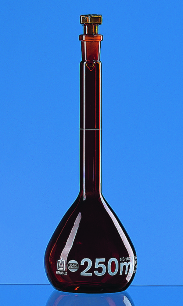 Volumetric flask 250 ml, BLAUBRAND® Class A, CoC, amber glass, borosilicate 3.3, NS 14/23, glass stopper,